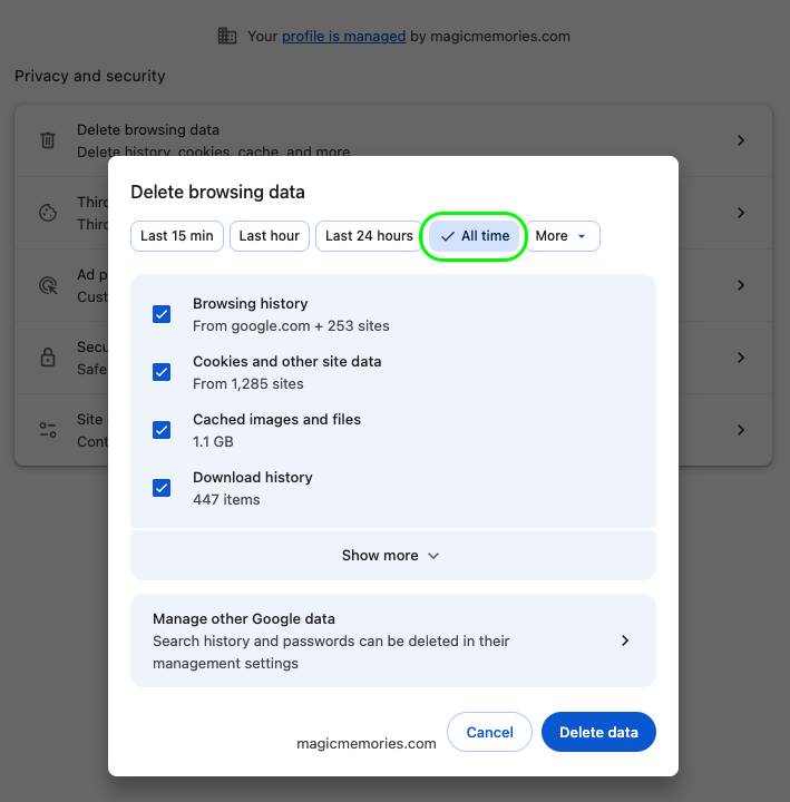Please note that deleting all of your history will log you out of everywhere and you will need to log back in. This is why we advise testing in Incognito first, so you aren't deleting your history unnecessarily.
