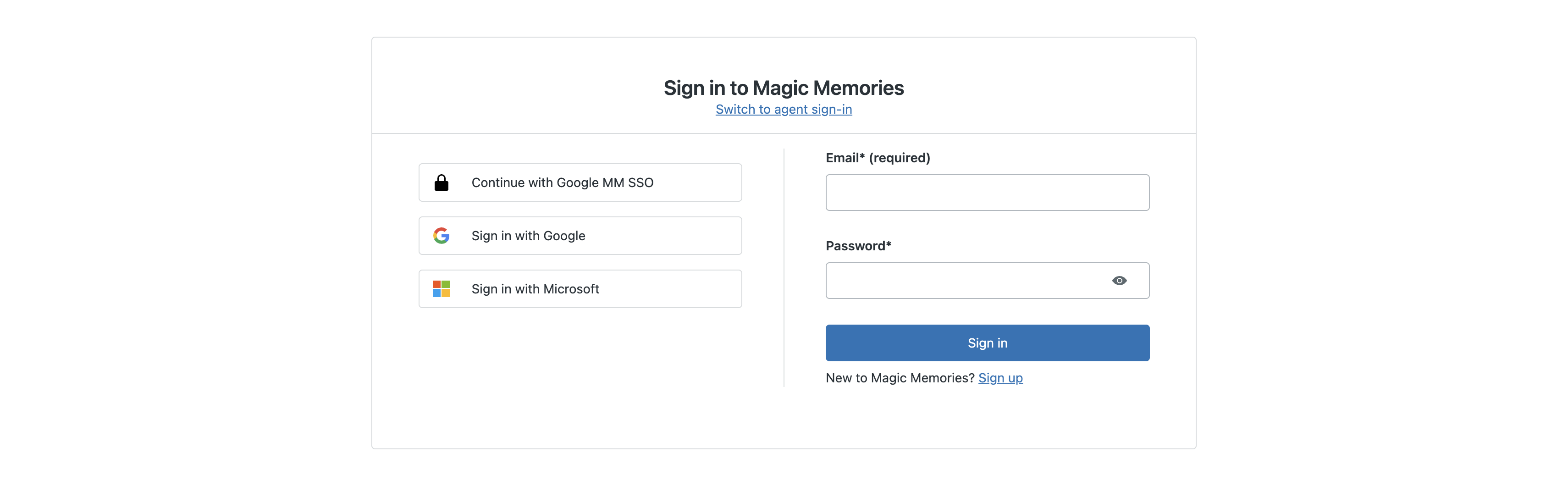 Si trabajas para uno de nuestros Clientes (por ejemplo, Merlin, Skyline, etc.) o te han asignado una dirección de correo electrónico externa (site.external@magicmemories.com), debes iniciar sesión usando la cuenta específica proporcionada por tu empleador.